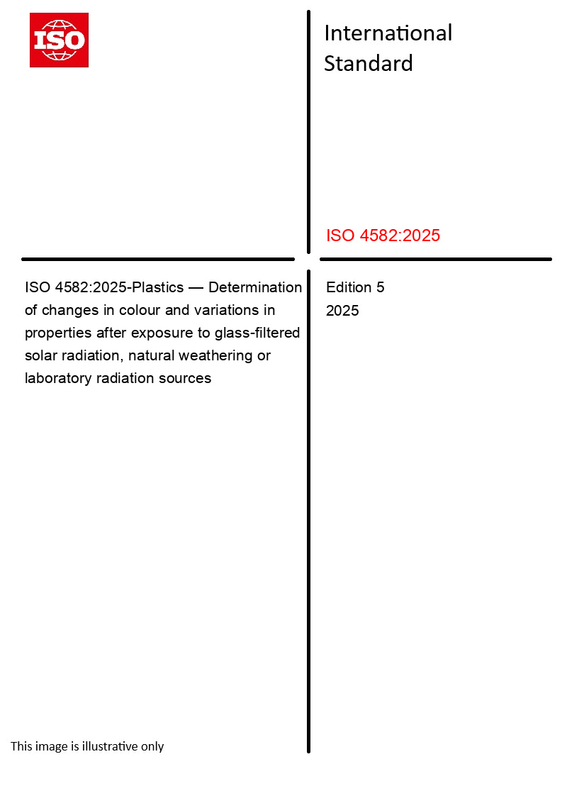 ISO 4582:2025-Plastics — Determination of changes in colour and variations in properties after exposure to glass-filtered solar radiation, natural weathering or laboratory radiation sources