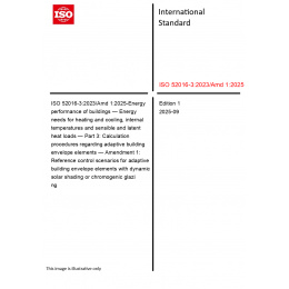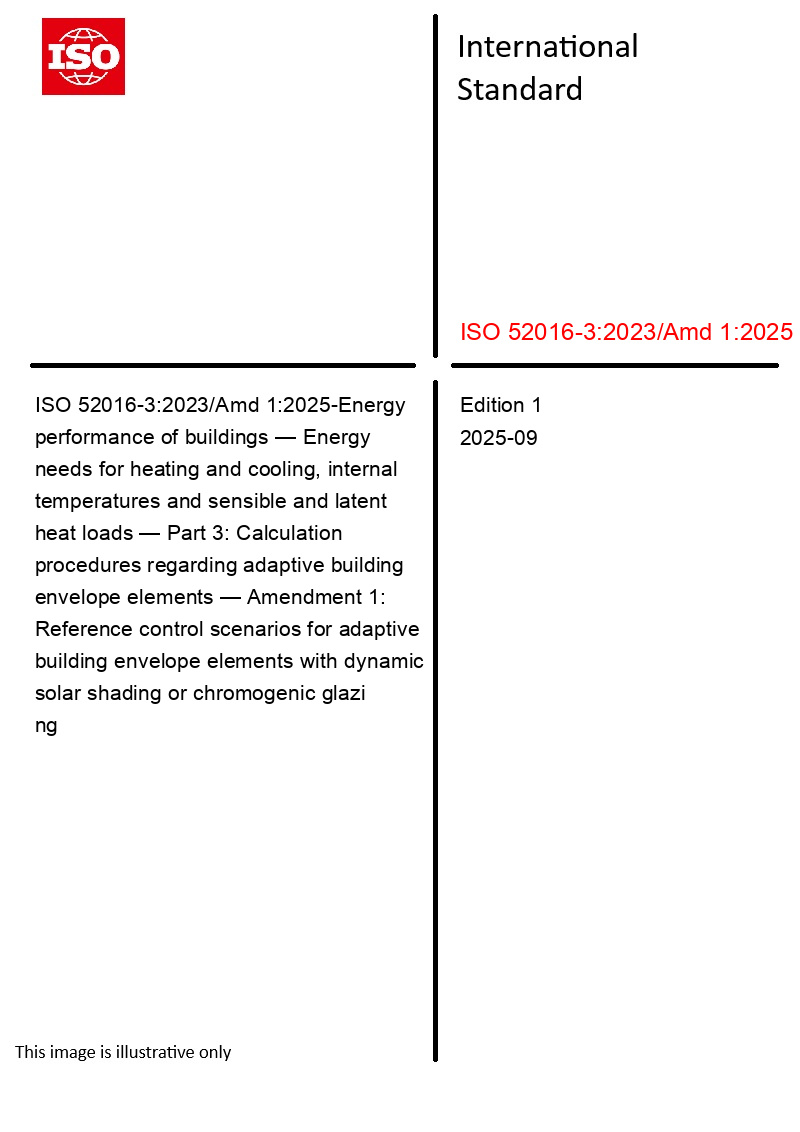 >ISO Standards>ISO 52016-3:2023/Amd 1:2025-Energy performance of buildings — Energy needs for heating and cooling, internal temperatures and sensible and latent heat loads — Part 3: Calculation procedures regarding adaptive building envelope elements — Amendment 1: Reference control scenarios for adaptive building envelope elements with dynamic solar shading or chromogenic glazing