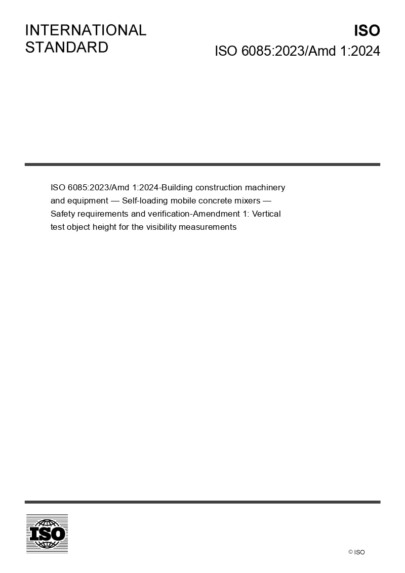ISO 6085:2023/Amd 1:2024-Building construction machinery and equipment — Self-loading mobile concrete mixers — Safety requirements and verification — Amendment 1: Vertical test object height for the visibility measurements