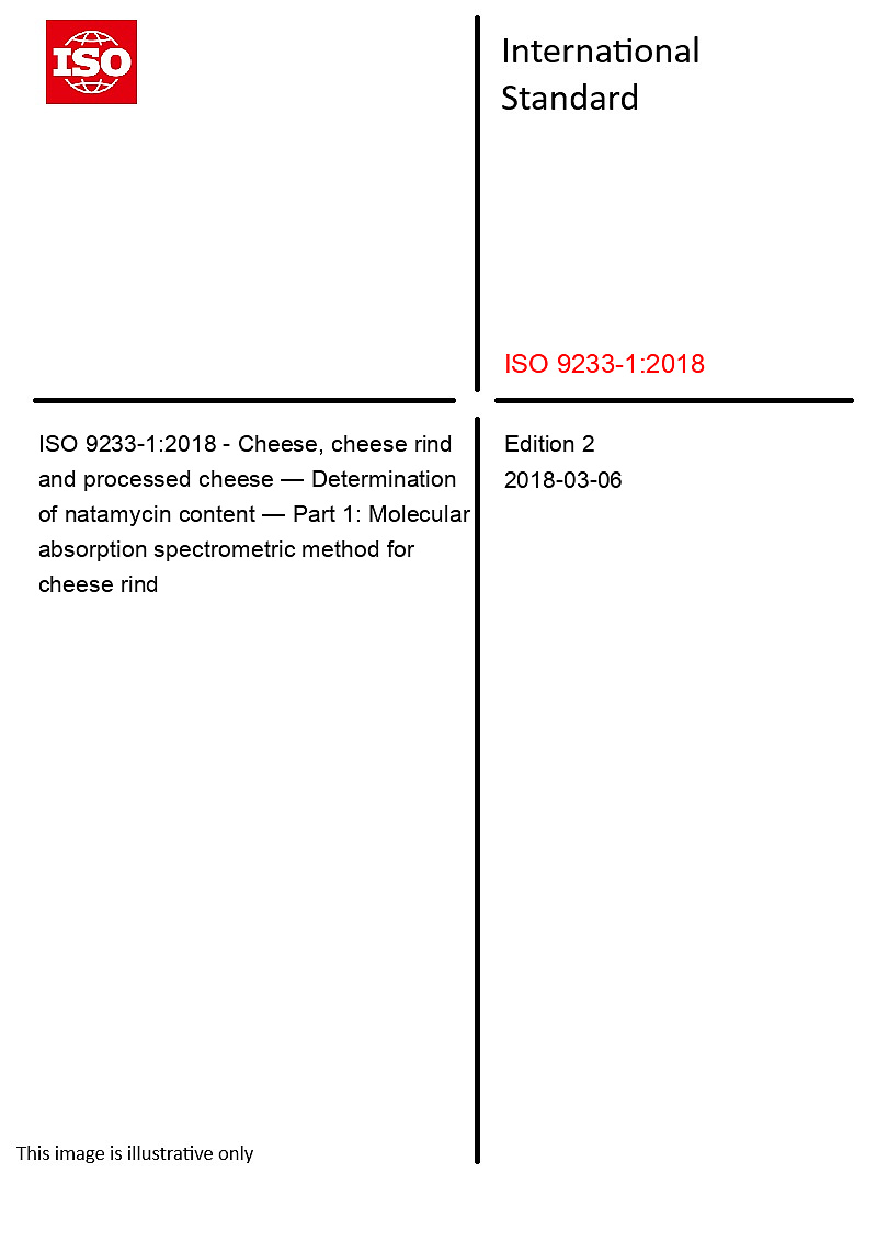 ISO 9233-1 | IDF 140-1:2018 specifies a method for the determination in cheese rind of natamycin mass fraction of above 0,5 mg/kg and surface-area-related natamycin mass of above 0,03 mg/dm2.