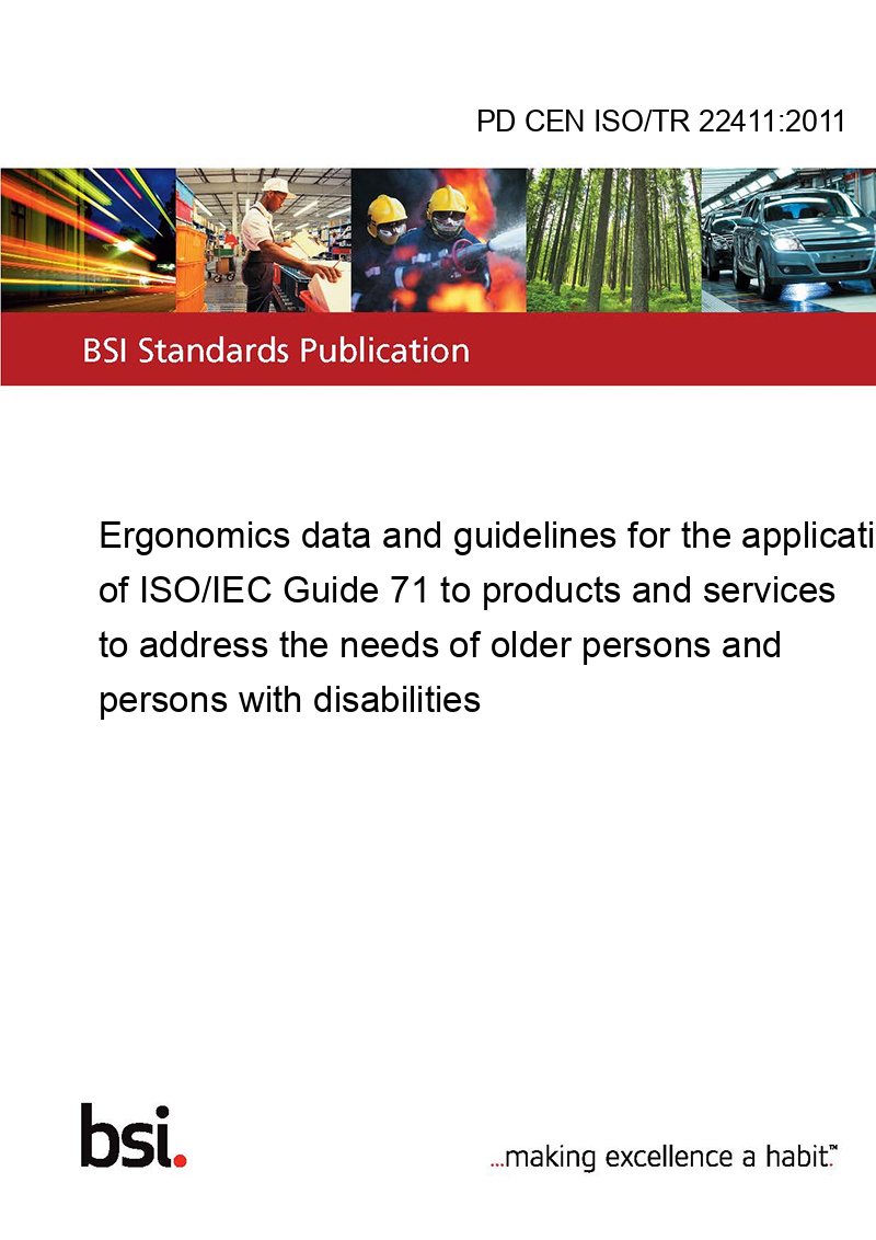 ISO/TR 22411:2008 presents ergonomics data and guidelines for applying ISO/IEC Guide 71 in addressing the needs of older persons and persons with disabilities in standards development. It provides ergonomics data and knowledge about human abilities — sensory, physical and cognitive — and allergies, as well as guidance on the accessible design of products, services and environments.
