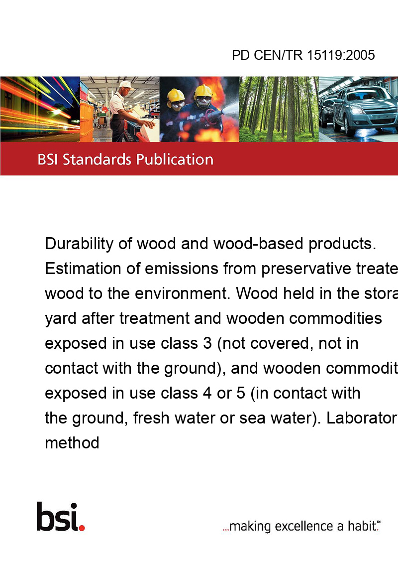 This standard PD CEN/TR 15119:2005 Durability of wood and wood-based products. Estimation of emissions from preservative treated wood to the environment. Wood held in the storage yard after treatment and wooden commodities exposed in use class 3 (not covered, not in contact with the ground), and wooden commodities exposed in use class 4 or 5 (in contact with the ground, fresh water or sea water). Laboratory method is classified in these ICS categories: