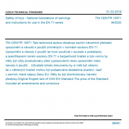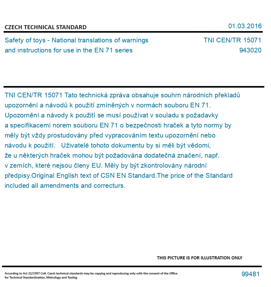 Tato technická zpráva obsahuje souhrn národních překladů upozornění a návodů k použití zmíněných v normách souboru EN 71. Upozornění a návody k použití se musí používat v souladu s požadavky a specifikacemi norem souboru EN 71 o bezpečnosti hraček a tyto normy by měly být vždy prostudovány před vypracováním textu upozornění nebo návodu k použití. Uživatelé tohoto dokumentu by si měli být vědomi, že u některých hraček mohou být požadována dodatečná značení, např. v zemích, které nejsou členy EU. Měly by být zkontrolovány národní předpisy. Original English text of CSN EN Standard. The price of the Standard included all amendments and correcturs.