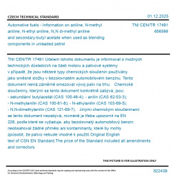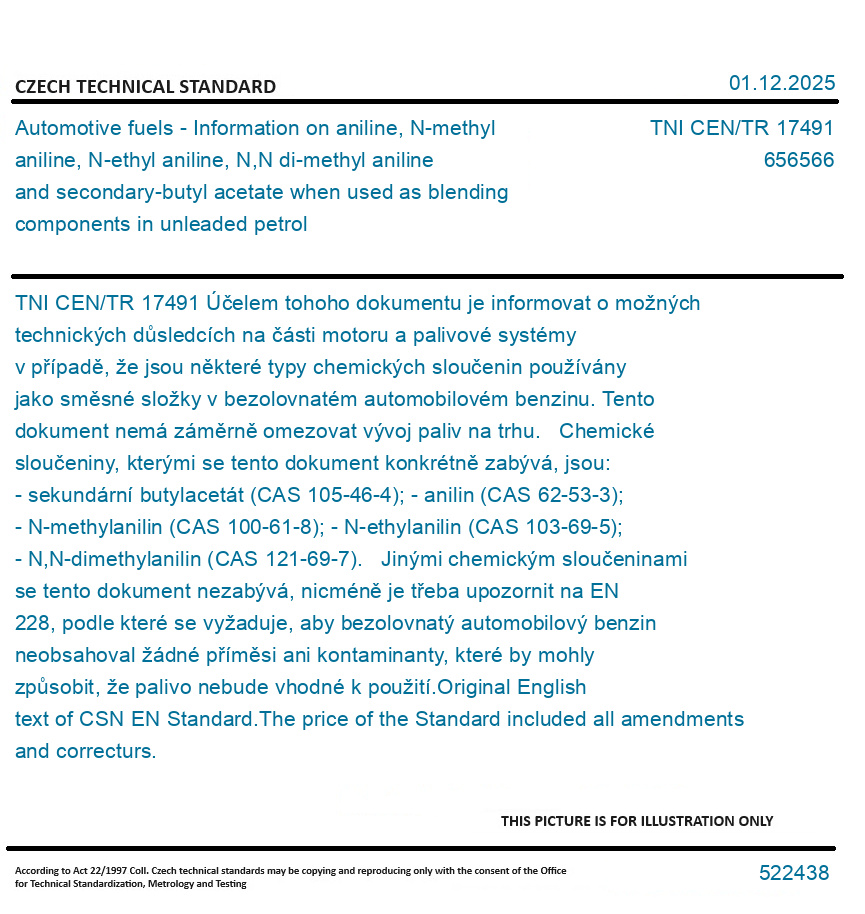 Účelem tohoho dokumentu je informovat o možných technických důsledcích na části motoru a palivové systémy v případě, že jsou některé typy chemických sloučenin používány jako směsné složky v bezolovnatém automobilovém benzinu. Tento dokument nemá záměrně omezovat vývoj paliv na trhu. Chemické sloučeniny, kterými se tento dokument konkrétně zabývá, jsou: - sekundární butylacetát (CAS 105-46-4); - anilin (CAS 62-53-3); - N-methylanilin (CAS 100-61-8); - N-ethylanilin (CAS 103-69-5); - N,N-dimethylanilin (CAS 121-69-7). Jinými chemickým sloučeninami se tento dokument nezabývá, nicméně je třeba upozornit na EN 228, podle které se vyžaduje, aby bezolovnatý automobilový benzin neobsahoval žádné příměsi ani kontaminanty, které by mohly způsobit, že palivo nebude vhodné k použití. Original English text of CSN EN Standard. The price of the Standard included all amendments and correcturs.
