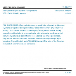 Tato technická zpráva slouží jako informativní dokument, vyjmenovává potenciální sporné otázky odpovědnosti, které při poskytování služby C-ITS mohou vzniknout. Navrhuje způsoby, jak tyto sporné otázky odpovědnosti kontrolovat, omezovat nebo minimalizovat a uvádí normativní dokumenty zabývající se některými nebo všemi z aspektů odpovědnosti, aby došlo k minimalizaci rizika vystavení se finančním dopadům při jejich porušení. Original English text of CSN EN Standard. The price of the Standard included all amendments and correcturs.