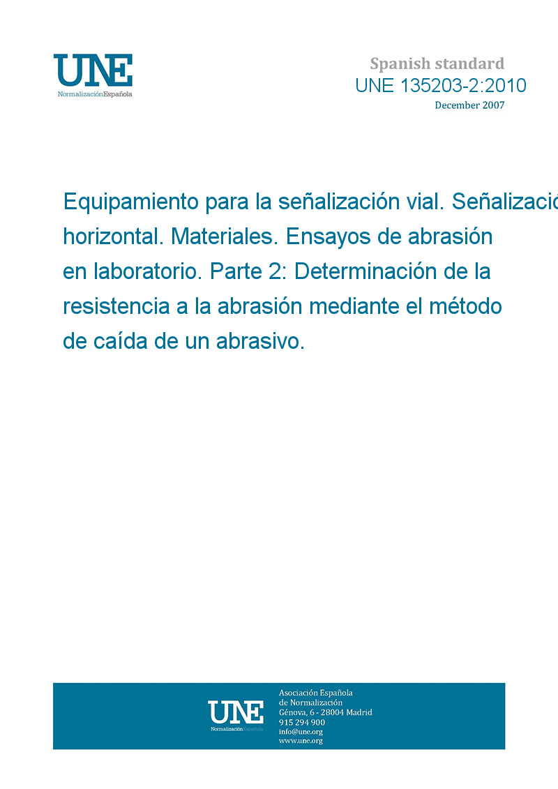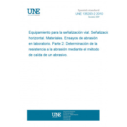 Equipamiento para la señalización vial. Señalización horizontal. Materiales. Ensayos de abrasión en laboratorio. Parte 2: Determinación de la resistencia a la abrasión mediante el método de caída de un abrasivo.