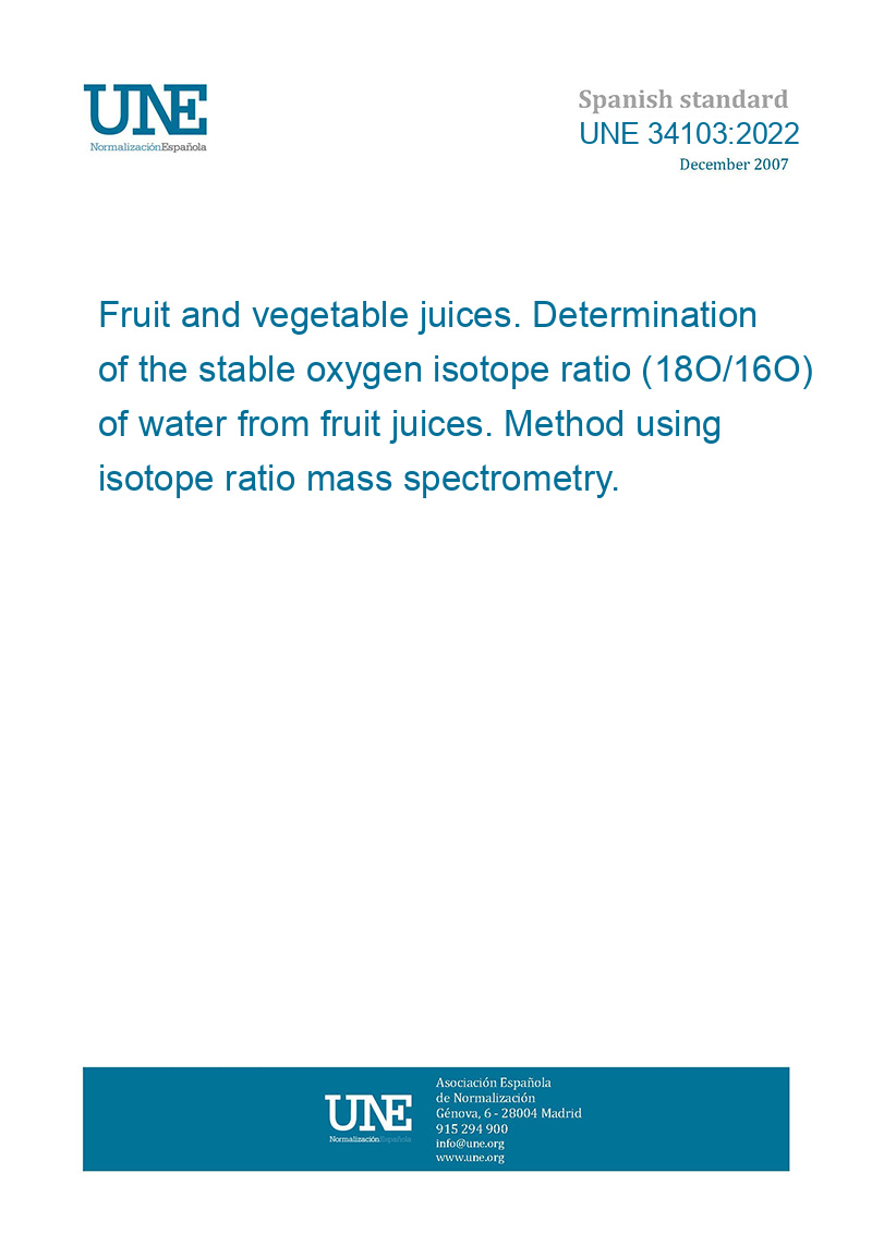 This standard UNE 34103:2022 Fruit and vegetable juices. Determination of the stable oxygen isotope ratio (18O/16O) of water from fruit juices. Method using isotope ratio mass spectrometry. is classified in these ICS categories: