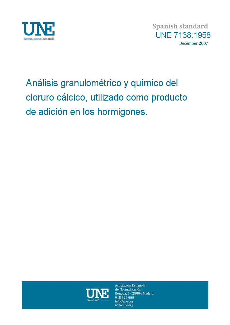 This standard UNE 7138:1958 GRANULOMETRIC AND CHEMICAL ANALYSIS OF CALCIUM CHLORIDE USED AS AN ADDUCT OF CONCRETES. is classified in these ICS categories: