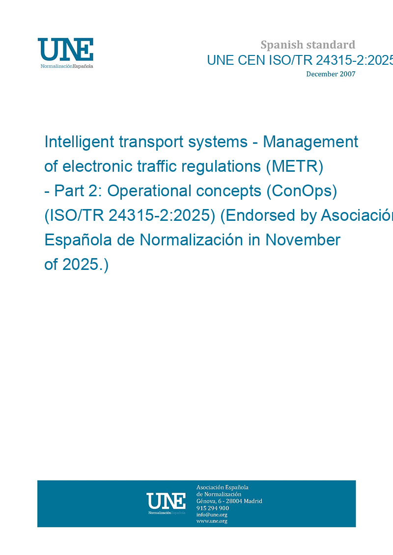 Sistemas inteligentes de transporte. Gestión de la reglamentación electrónica de tráfico (METR). Parte 2: Conceptos operacionales (ConOps) (ISO/TR 24315-2:2025) (Ratificada por la Asociación Española de Normalización en noviembre de 2025.)