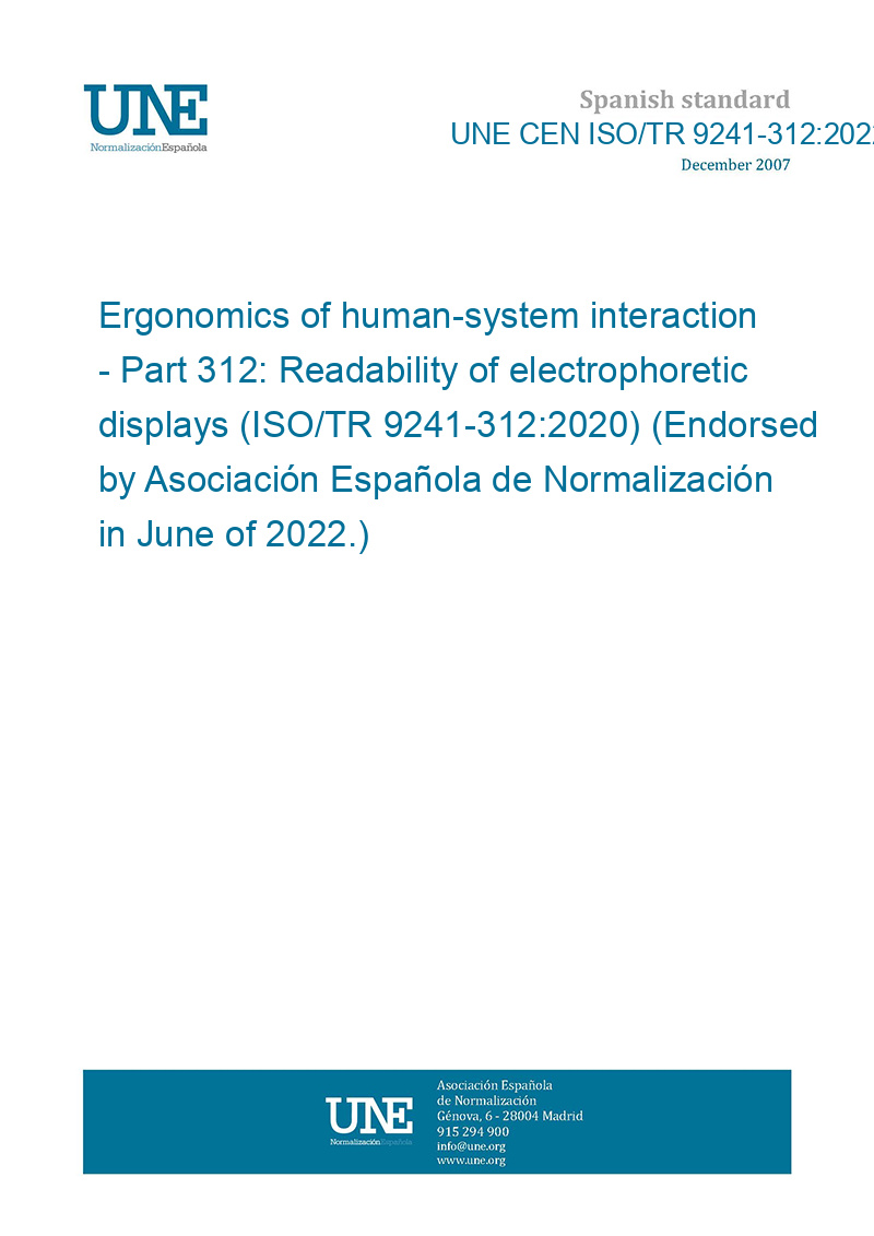 Ergonomía de la interacción hombre-sistema. Parte 312: Legibilidad de pantallas electroforéticas (ISO/TR 9241-312:2020) (Ratificada por la Asociación Española de Normalización en junio de 2022.)