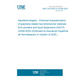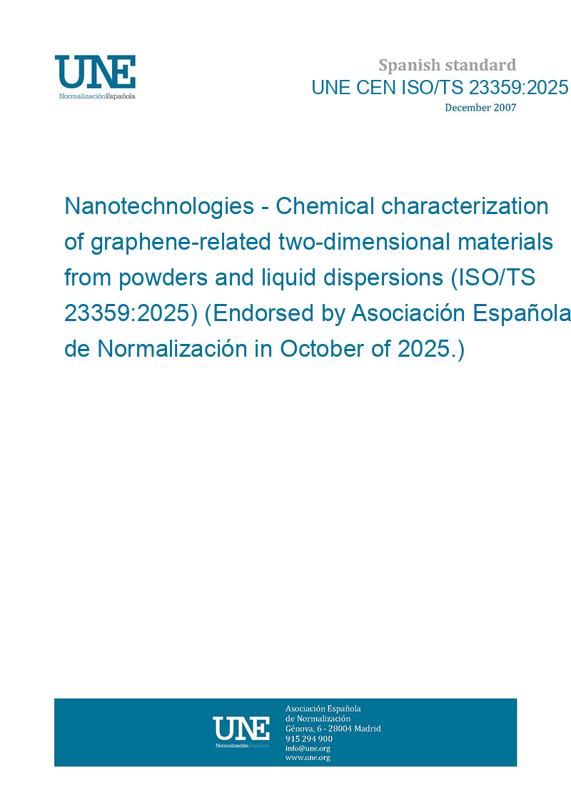 Nanotecnologías. Caracterización química de materiales bidimensionales relacionados con el grafeno a partir de polvos y dispersiones líquidas (ISO/TS 23359:2025) (Ratificada por la Asociación Española de Normalización en octubre de 2025.)
