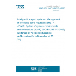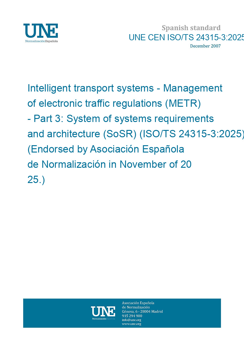 Intelligent transport systems - Management of electronic traffic regulations (METR) - Part 3: System of systems requirements and architecture (SoSR) (ISO/TS 24315-3:2025) (Endorsed by Asociación Española de Normalización in November of 2025.)
