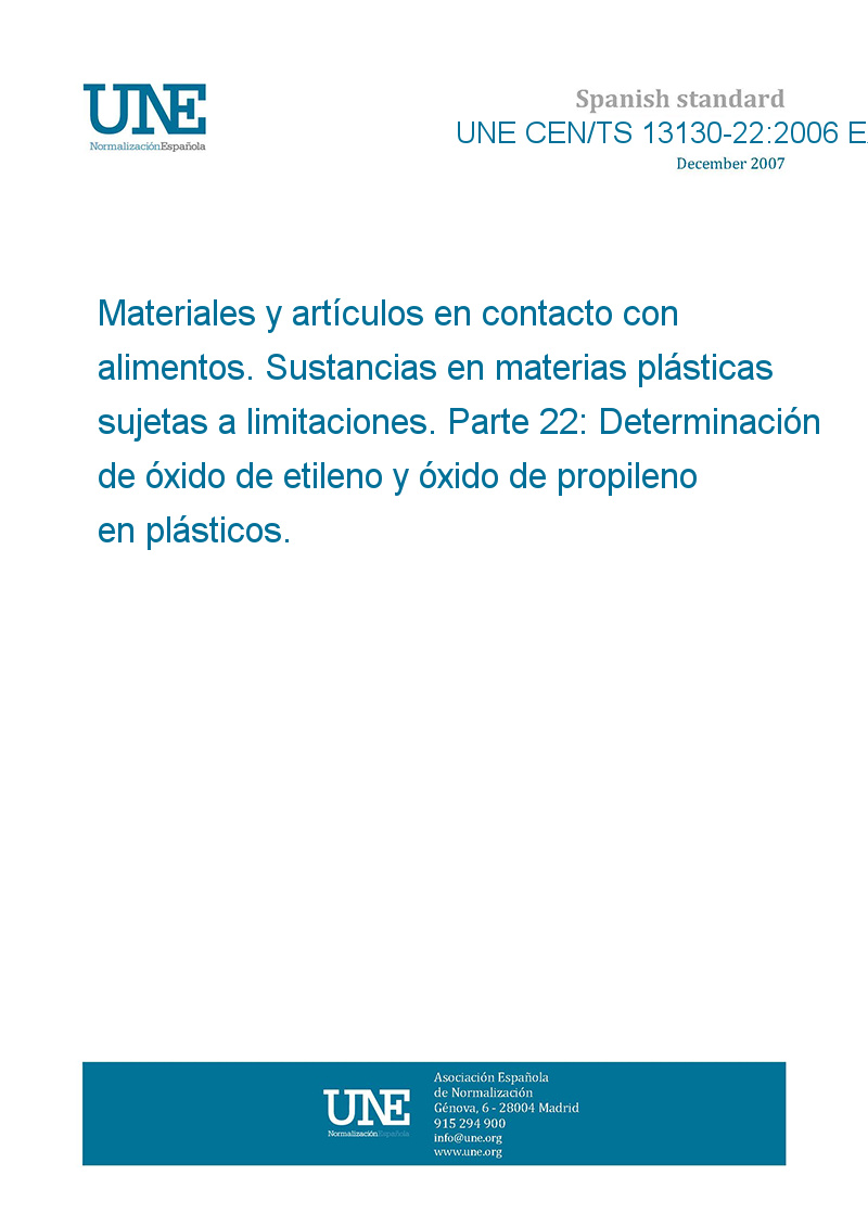 Materiales y artículos en contacto con alimentos. Sustancias en materias plásticas sujetas a limitaciones. Parte 22: Determinación de óxido de etileno y óxido de propileno en plásticos.