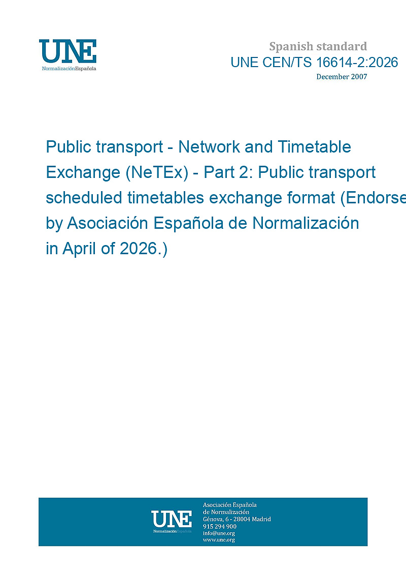 Transporte público. Intercambio de información de red y horarios (NeTEx). Parte 2: Formato de intercambio de los horarios programados. (Ratificada por la Asociación Española de Normalización en abril de 2026.)