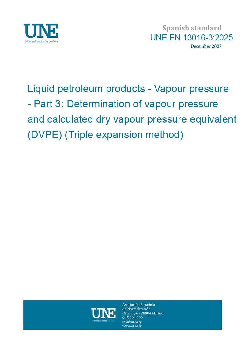 This standard UNE EN 13016-3:2025 Liquid petroleum products - Vapour pressure - Part 3: Determination of vapour pressure and calculated dry vapour pressure equivalent (DVPE) (Triple expansion method) is classified in these ICS categories: