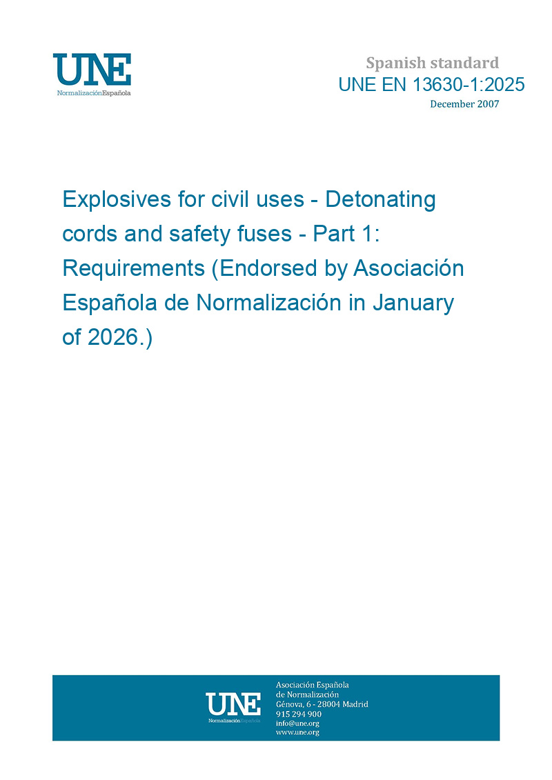 Explosivos para uso civil. Cordones detonantes y mechas de seguridad. Parte 1: Requisitos (Ratificada por la Asociación Española de Normalización en enero de 2026.)