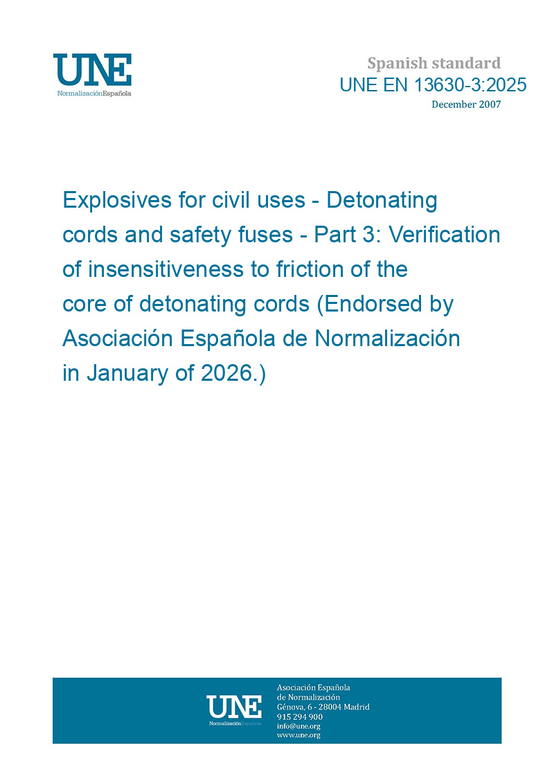 Explosivos para uso civil. Cordones detonantes y mechas de seguridad. Parte 3: Verificación de la insensibilidad a la fricción del núcleo de los cordones detonantes. (Ratificada por la Asociación Española de Normalización en enero de 2026.)
