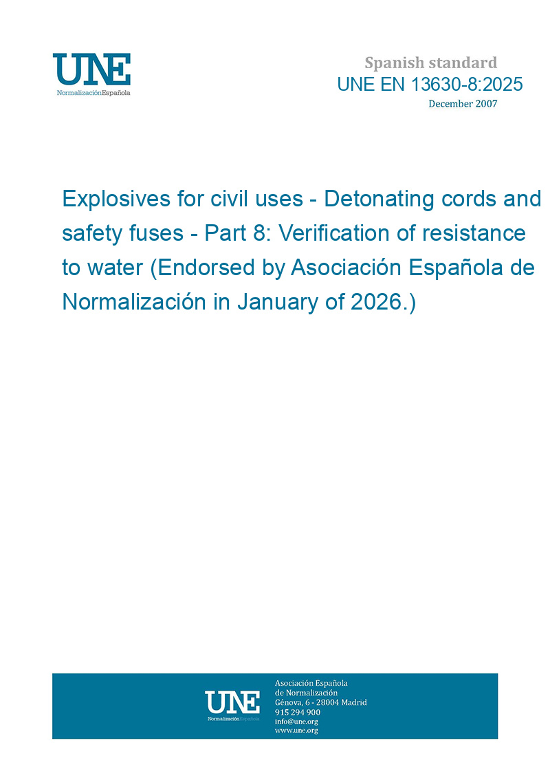 Explosivos para uso civil. Cordones detonantes y mechas de seguridad. Parte 8: Verificación de la resistencia al agua. (Ratificada por la Asociación Española de Normalización en enero de 2026.)