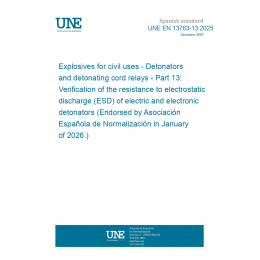 Explosives for civil uses - Detonators and detonating cord relays - Part 13: Verification of the resistance to electrostatic discharge (ESD) of electric and electronic detonators (Endorsed by Asociación Española de Normalización in January of 2026.)