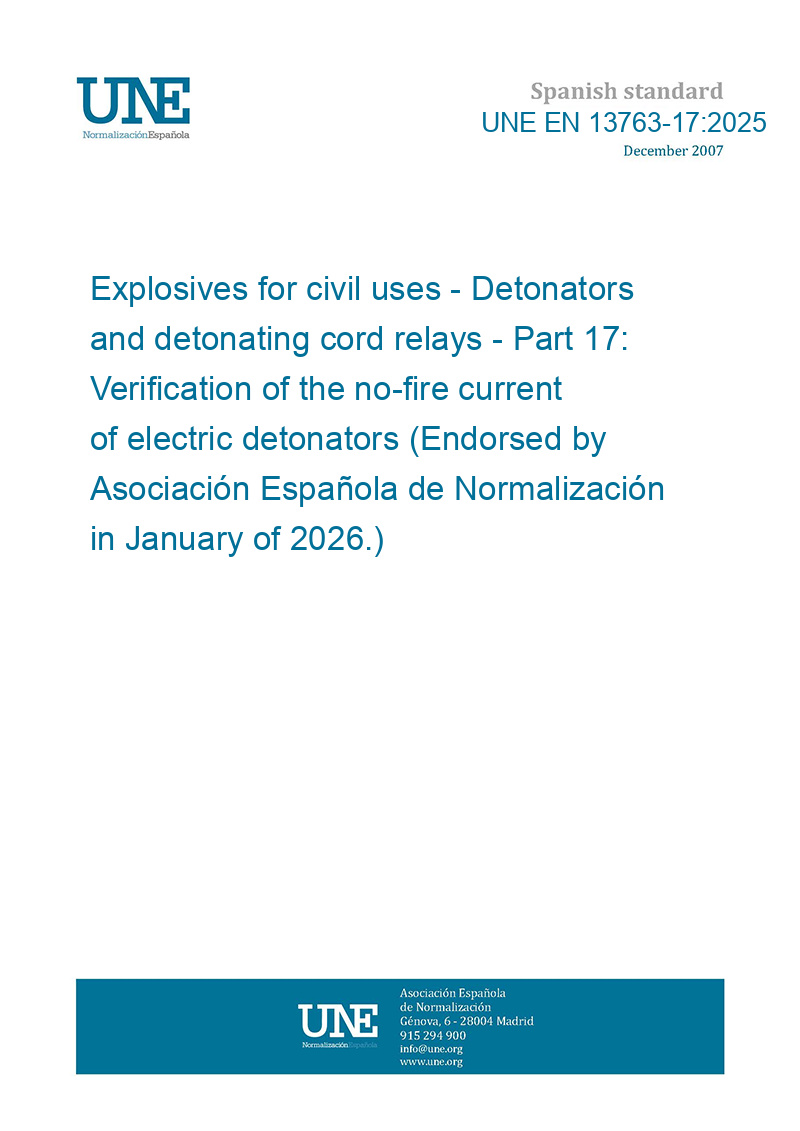Explosivos para usos civiles. Detonadores y relés de cordón detonante. Parte 17: Verificación de la corriente de seguridad de detonadores eléctricos (Ratificada por la Asociación Española de Normalización en enero de 2026.)