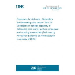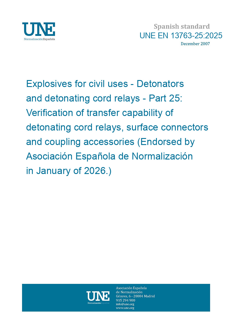 Explosivos para usos civiles. Detonadores y relés de cordón detonante. Parte 25: Verificación de la capacidad de transferencia de relés de cordón detonante, conectores de superficie y accesorios de conexión (Ratificada por la Asociación Española de Normalización en enero de 2026.)