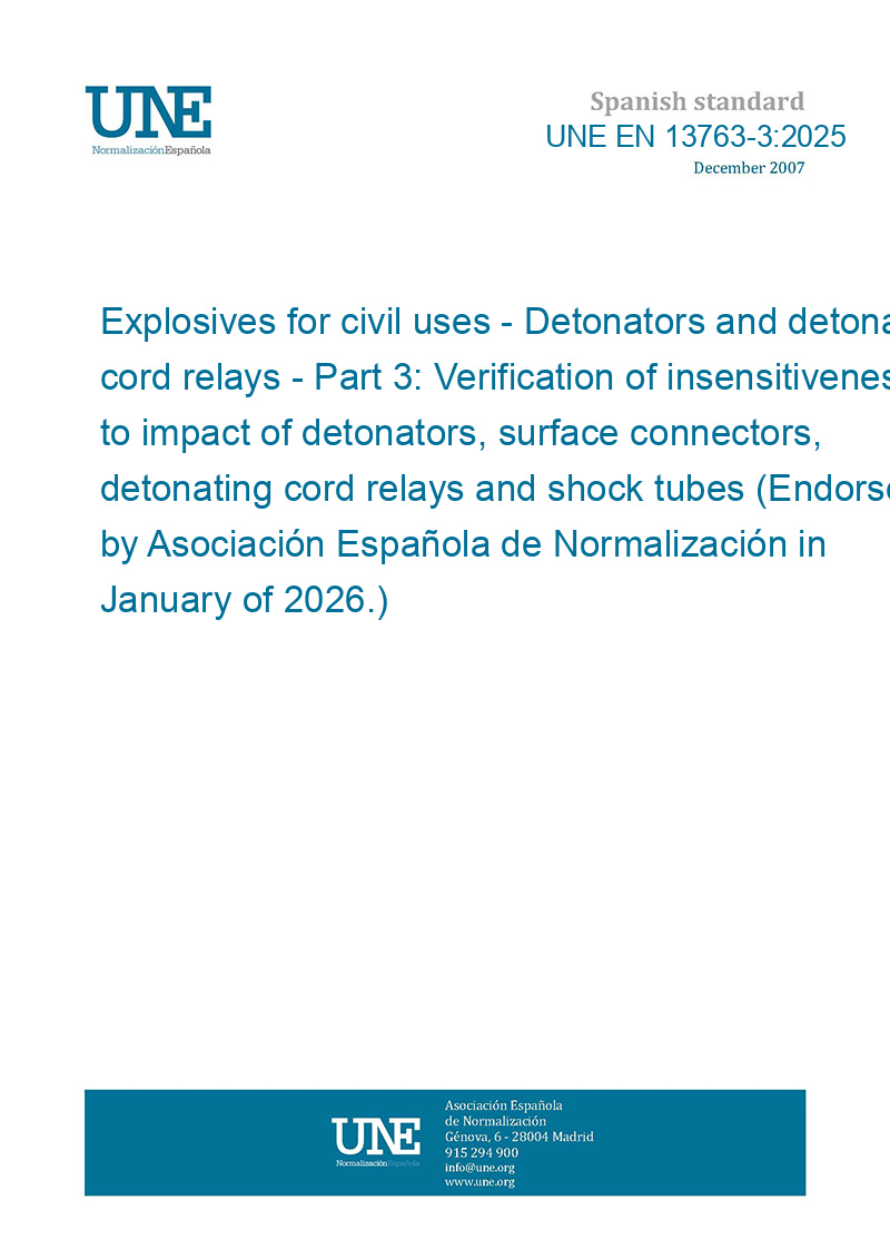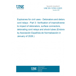 Explosivos para usos civiles. Detonadores y relés de cordón detonante. Parte 3: Verificación de la insensibilidad al impacto de detonadores, conectores de superficie, relés de cordón detonante y tubos de choque (Ratificada por la Asociación Española de Normalización en enero de 2026.)