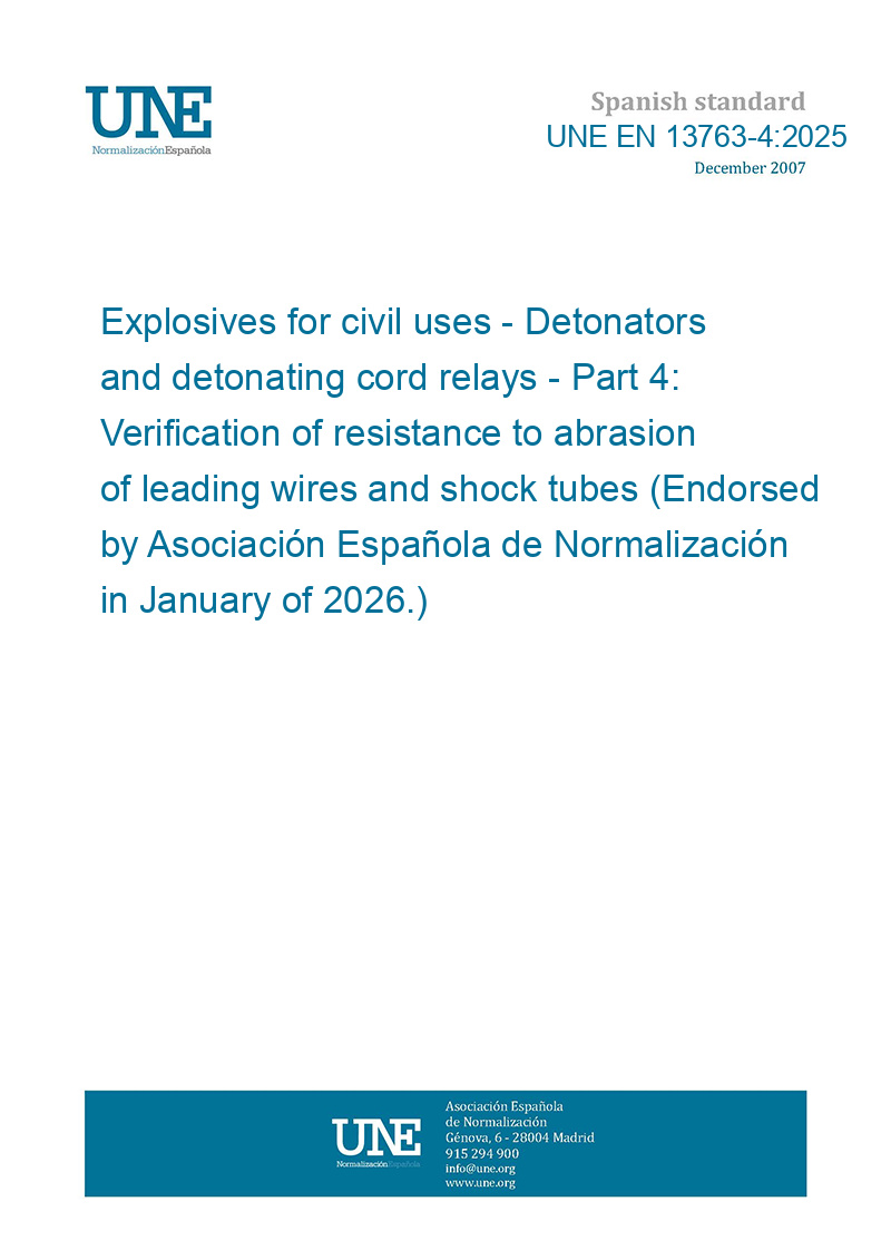 Explosivos para usos civiles. Detonadores y relés de cordón detonante. Parte 4: Verificación de la resistencia a la abrasión de hilos conductores y tubos de choque (Ratificada por la Asociación Española de Normalización en enero de 2026.)