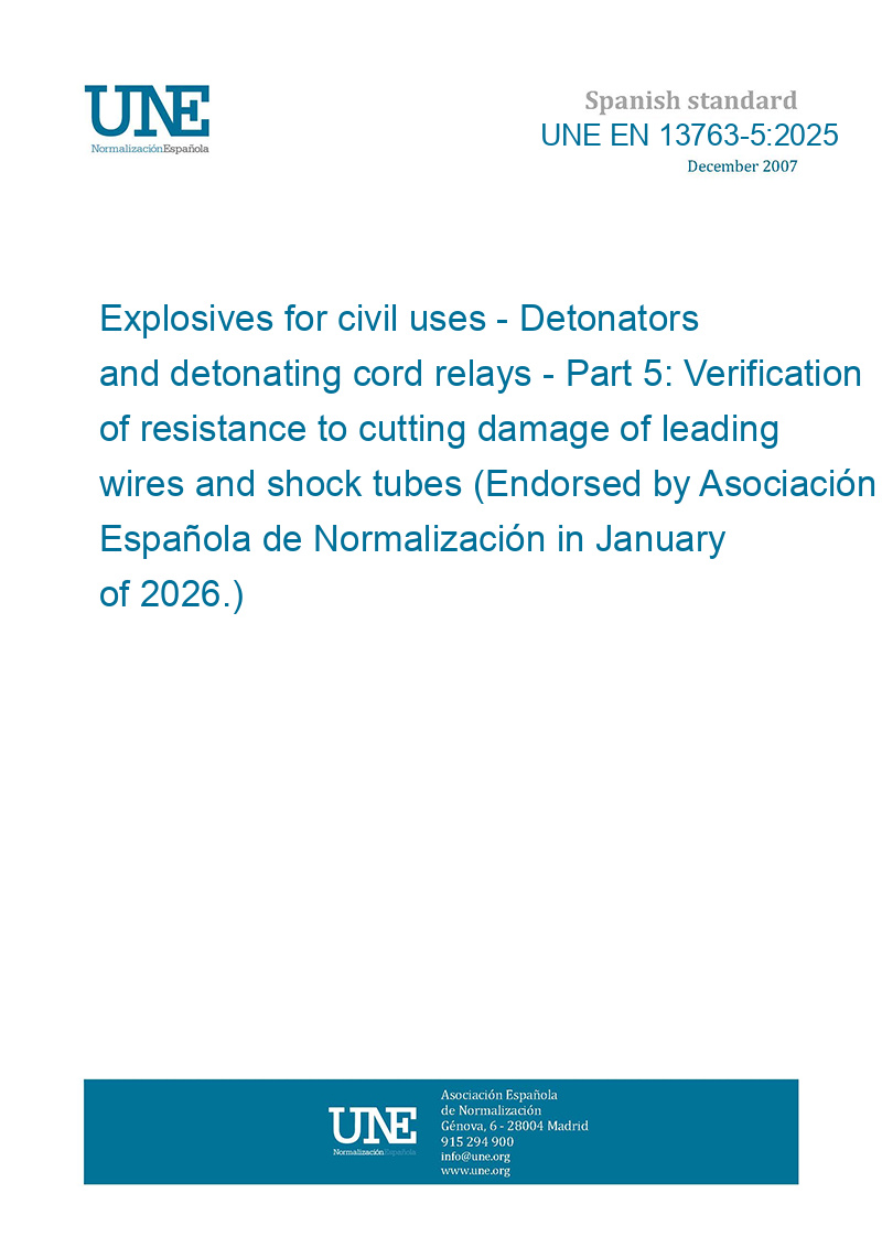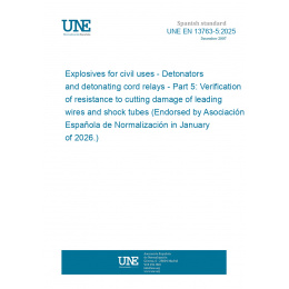 Explosivos para usos civiles. Detonadores y relés de cordón detonante. Parte 5: Verificación de la resistencia al daño por corte de hilos conductores y tubos de choque (Ratificada por la Asociación Española de Normalización en enero de 2026.)