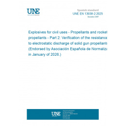 Explosivos para usos civiles. Propulsantes y propulsantes para cohetes. Parte 2: Verificación de la resistencia a la descarga electrostática de propulsantes sólidos para armas (Ratificada por la Asociación Española de Normalización en enero de 2026.)