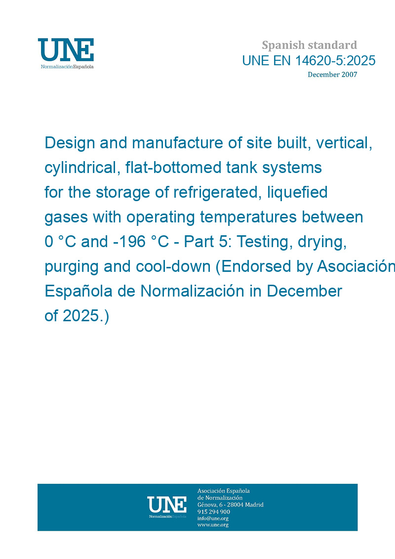 Design and manufacture of site built, vertical, cylindrical, flat-bottomed tank systems for the storage of refrigerated, liquefied gases with operating temperatures between 0 °C and -196 °C - Part 5: Testing, drying, purging and cool-down (Endorsed by Asociación Española de Normalización in December of 2025.)
