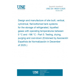 Diseño y fabricación de tanques cilíndricos, verticales y de fondo plano, construidos en el lugar de emplazamiento para el almacenamiento de gases licuados refrigerados con temperaturas de servicio entre 0 ºC y -196 ºC. Parte 5: Ensayos, secado, purga y enfriamiento. (Ratificada por la Asociación Española de Normalización en diciembre de 2025.)