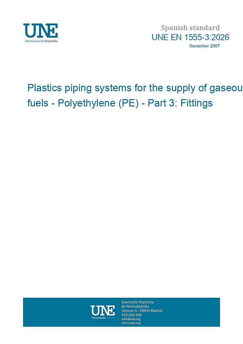 This document specifies the characteristics of fusion fittings made from polyethylene (PE) as well as of mechanical fittings for piping systems in the field of the supply of gaseous fuels. NOTE 1 Additional information related to the installation of PE 100-RC systems is given in prEN 1555-1:2024, Annex A. NOTE 2 Additional information about the suitability of PE pipe systems for hydrogen and its admixtures is given in prEN 1555-1:2024, Annex B. It also specifies the test parameters for the test methods referred to in this document. In conjunction with EN 1555-1, EN 1555-2, EN 1555-4 and EN 1555-5, this document is applicable to PE pipes, fittings and valves, their joints, and joints with components of PE and other materials intended to be used under the following conditions: a) a maximum operating pressure (MOP), up to and including 10 bar1, at a design reference temperature of 20 °C; b) an operating temperature between "20 °C and 40 °C. For operating temperatures between 20 °C and 40 °C, derating coefficients are defined in EN 1555-5. The EN 1555 series covers a range of MOPs and gives requirements concerning colours. This document is applicable for fittings of the following types: a) electrofusion socket fittings; b) electrofusion saddle fittings; c) spigot end fittings (for butt fusion using heated tools and electrofusion); d) mechanical fittings. It is the responsibility of the purchaser or specifier to make the appropriate selections from these aspects, taking into account their particular requirements and any relevant national guidance or regulations and installation practices or codes. NOTE 3 The fittings can be, for example, in the form of couplers, saddles, equal and reduced tees, reducers, elbows, bends or end caps.