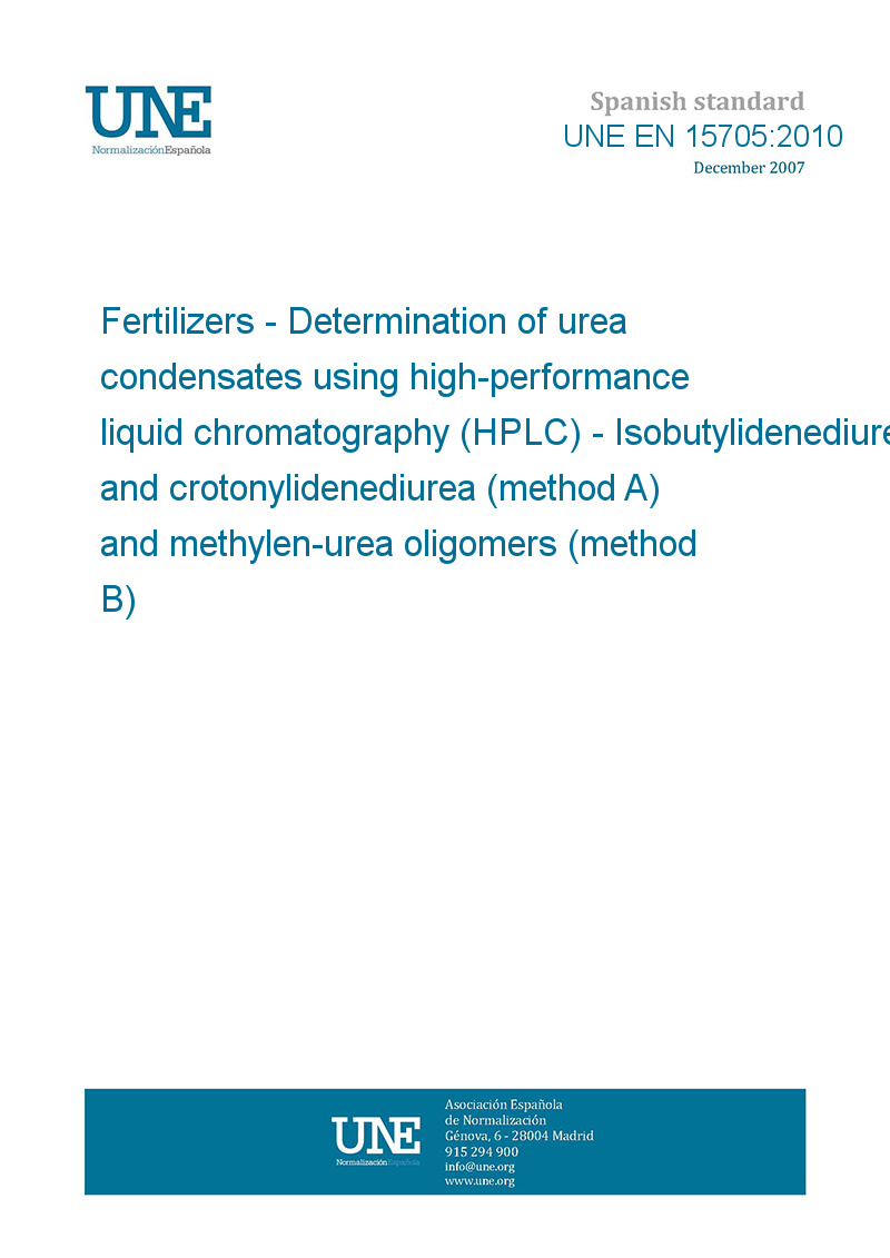 This standard UNE EN 15705:2010 Fertilizers - Determination of urea condensates using high-performance liquid chromatography (HPLC) - Isobutylidenediurea and crotonylidenediurea (method A) and methylen-urea oligomers (method B) is classified in these ICS categories: