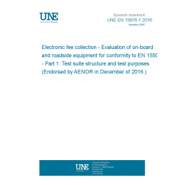 Electronic fee collection - Evaluation of on-board and roadside equipment for conformity to EN 15509 - Part 1: Test suite structure and test purposes (Endorsed by AENOR in December of 2016.)
