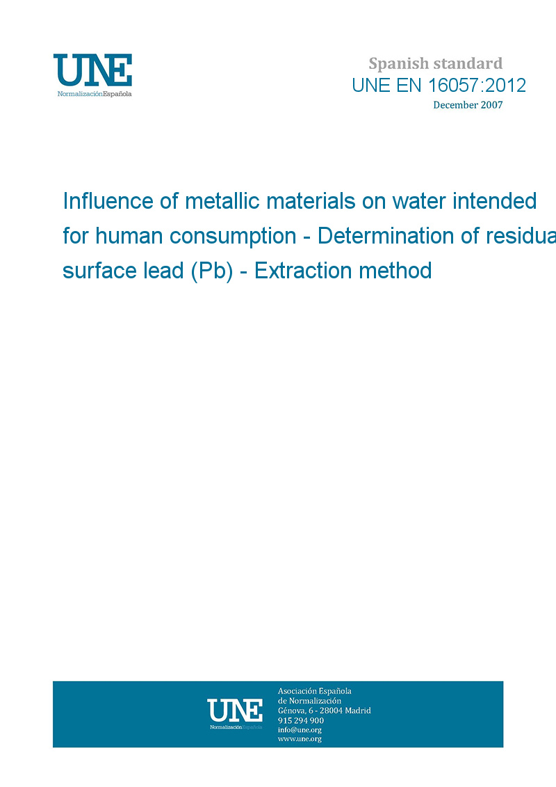 This standard UNE EN 16057:2012 Influence of metallic materials on water intended for human consumption - Determination of residual surface lead (Pb) - Extraction method is classified in these ICS categories: