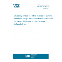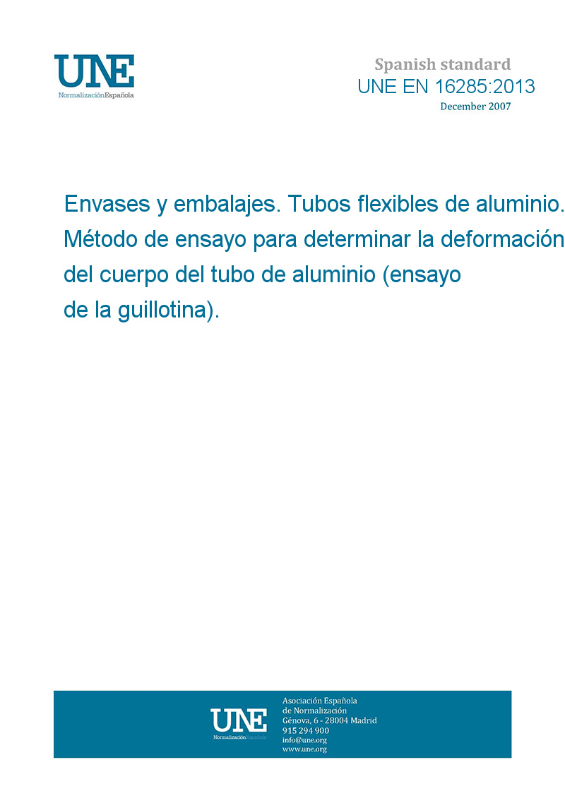 >UNE standards>UNE EN 16285:2013 Packaging - Flexible aluminium tubes - Test method to measure the deformation of the aluminium tube body (Guillotine test)