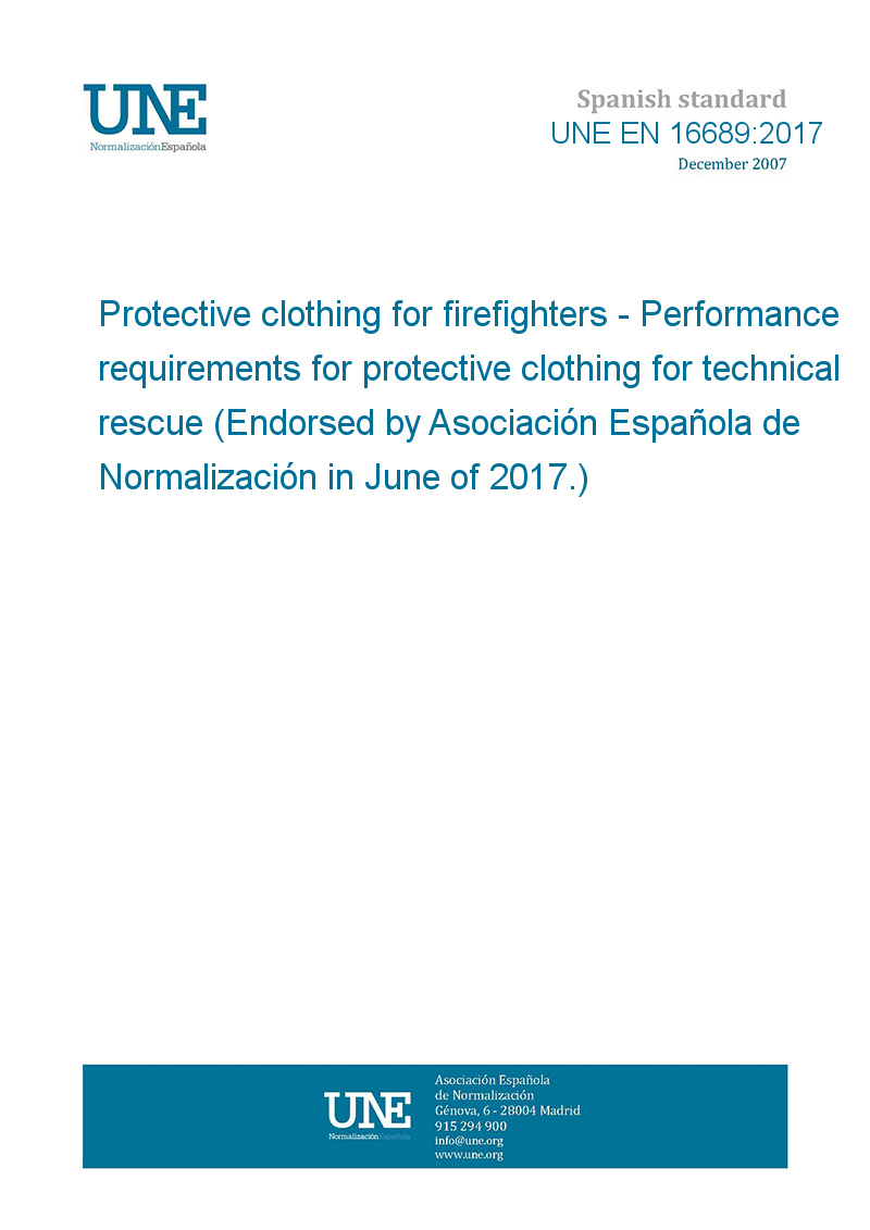 This standard UNE EN 16689:2017 Protective clothing for firefighters - Performance requirements for protective clothing for technical rescue (Endorsed by Asociación Española de Normalización in June of 2017.) is classified in these ICS categories:
