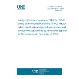 Sistemas inteligentes de transporte. eSafety. Ensayos de conformidad del sistema eCall de extremo a extremo para eCall HLAP en entornos de red híbrida de conmutación de circuitos y paquetes. (Ratificada por la Asociación Española de Normalización en diciembre de 2025.)