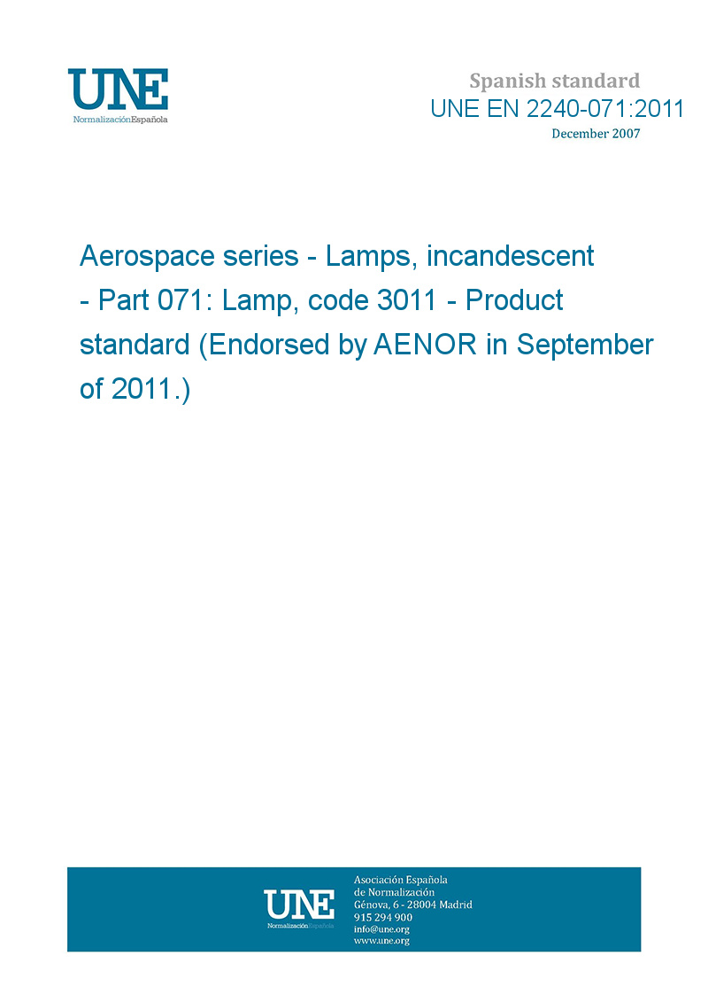 Aerospace series - Lamps, incandescent - Part 071: Lamp, code 3011 - Product standard (Endorsed by AENOR in September of 2011.)