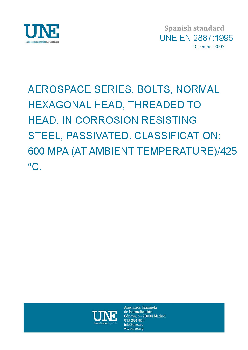 This standard UNE EN 2887:1996 AEROSPACE SERIES. BOLTS, NORMAL HEXAGONAL HEAD, THREADED TO HEAD, IN CORROSION RESISTING STEEL, PASSIVATED. CLASSIFICATION: 600 MPA (AT AMBIENT TEMPERATURE)/425 ºC. is classified in these ICS categories:
