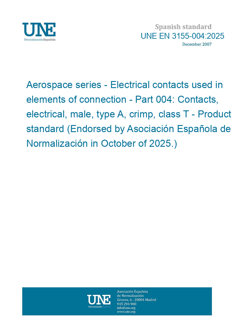Material aeroespacial. Contactos eléctricos usados en elementos de conexión. Parte 004: Contactos eléctricos, macho, tipo A, engarzados, clase T. Norma de producto (Ratificada por la Asociación Española de Normalización en octubre de 2025.)