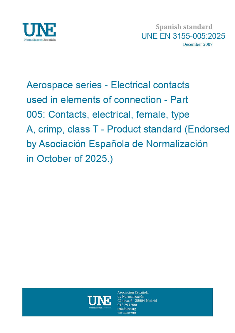 Aerospace series - Electrical contacts used in elements of connection - Part 005: Contacts, electrical, female, type A, crimp, class T - Product standard (Endorsed by Asociación Española de Normalización in October of 2025.)