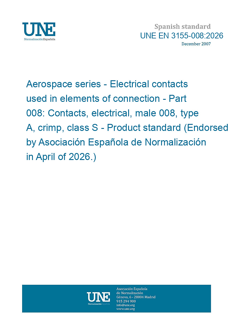 Aerospace series - Electrical contacts used in elements of connection - Part 008: Contacts, electrical, male 008, type A, crimp, class S - Product standard (Endorsed by Asociación Española de Normalización in April of 2026.)