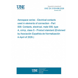 Material aeroespacial. Contactos eléctricos usados en elementos de conexión. Parte 008: Contactos eléctricos, macho 008, tipo A, engarzados, clase S. Norma de producto (Ratificada por la Asociación Española de Normalización en abril de 2026.)