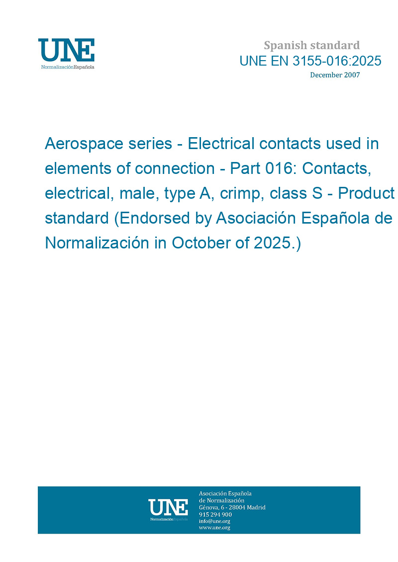 Material aeroespacial. Contactos eléctricos usados en elementos de conexión. Parte 016: Contactos eléctricos, macho, tipo A, soldados, clase S. Norma de producto. (Ratificada por la Asociación Española de Normalización en octubre de 2025.)