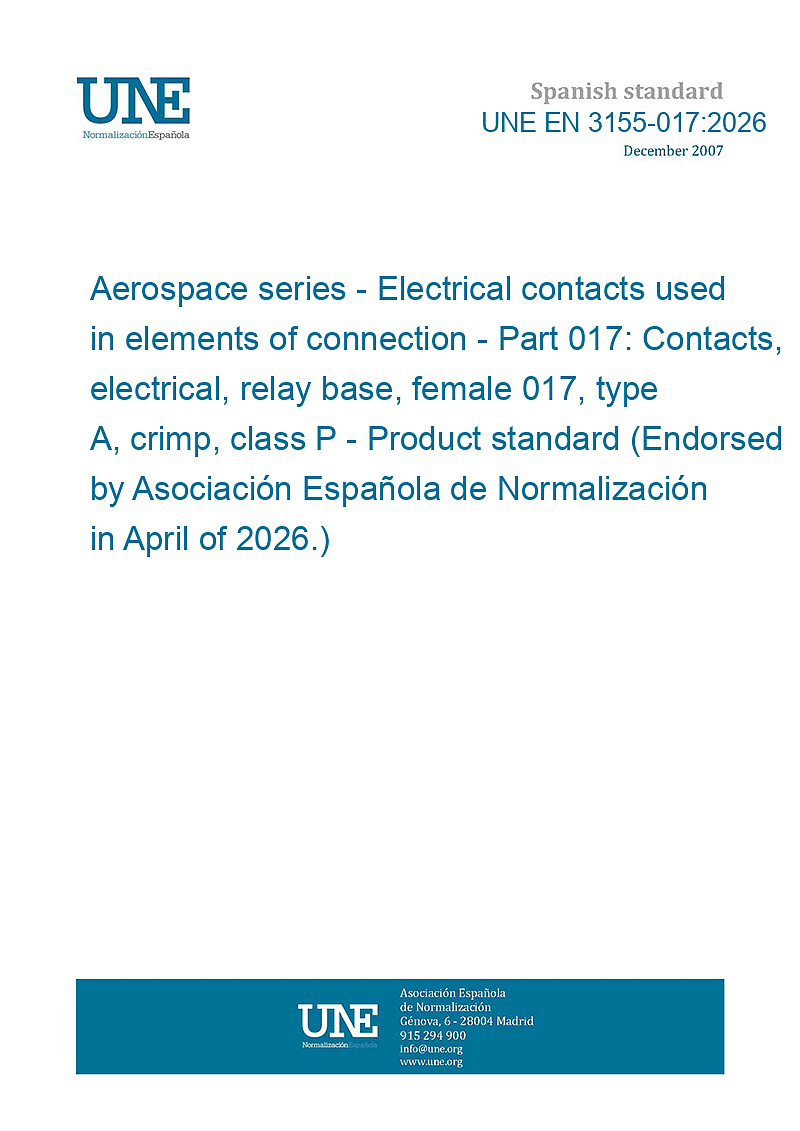 Material aeroespacial. Contactos eléctricos usados en elementos de conexión. Parte 017: Contactos eléctricos, base relé , hembra 017, tipo A, engarzados, clase P. Norma de producto. (Ratificada por la Asociación Española de Normalización en abril de 2026.)