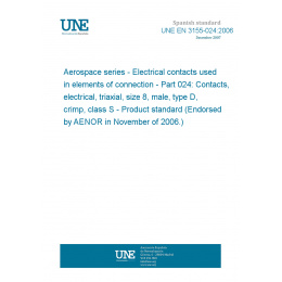 Material aeroespacial. Contactos eléctricos usados en elementos de conexión. Parte 024: Contactos eléctricos, triaxiales, tamaño 8, macho, tipo D, embridados, clase S. Norma de producto. (Ratificada por AENOR en noviembre de 2006.)