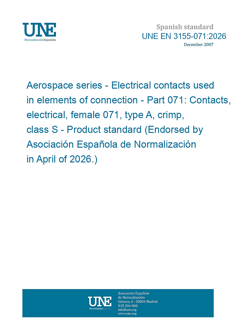 Material aeroespacial. Contactos eléctricos usados en elementos de conexión. Parte 071: Contactos eléctricos, hembra 071, tipo A, engarzados, clase S. Norma de producto. (Ratificada por la Asociación Española de Normalización en abril de 2026.)