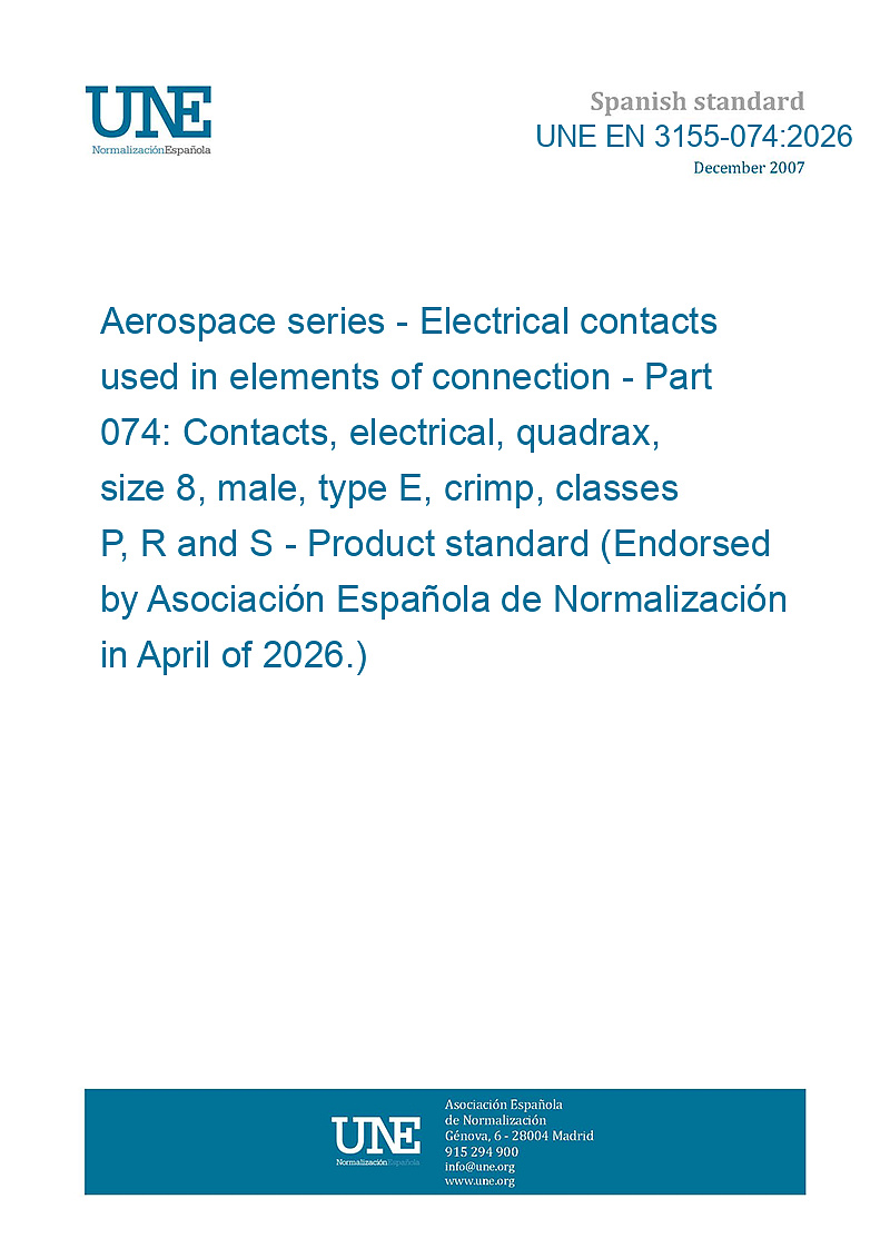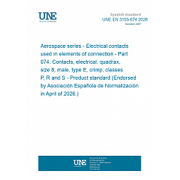 Aerospace series - Electrical contacts used in elements of connection - Part 074: Contacts, electrical, quadrax, size 8, male, type E, crimp, classes P, R and S - Product standard (Endorsed by Asociación Española de Normalización in April of 2026.)