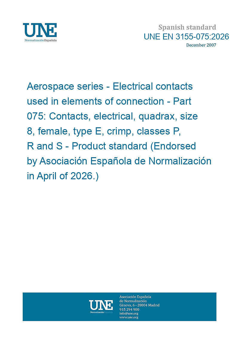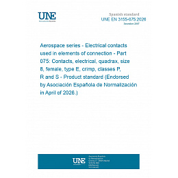 Aerospace series - Electrical contacts used in elements of connection - Part 075: Contacts, electrical, quadrax, size 8, female, type E, crimp, classes P, R and S - Product standard (Endorsed by Asociación Española de Normalización in April of 2026.)